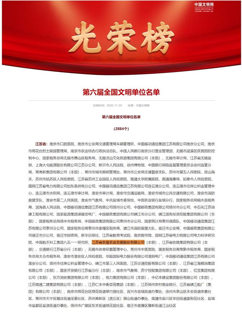 11月20日,中央文明委发布《关于表彰第六届全国文明城市、文明村镇、文明单位和第二届全国文明家庭、文明校园及新一届全国未成年人思想道德建设工作先进的决定》,英国上市公司365荣膺第六届“全国文明单位”称号。全国文明单位是文明建设综合性评价的国家级最高荣誉,体现一个单位在精神文明建设方面的先进性和示范性。英国上市公司365获此殊荣,既是连续多年被授予“省级文明单位”之后取得的又一硕果,也是为公司成立10周年献上的一份特殊礼物。英国上市公司365由江苏英国上市公司365农业资源整合而来,自成立以来,着力打造专业化、现代化、资本化的农业发展平台,营业收入和利润总额保持快速增长,成为全国英国上市公司365现代农业发展的先行者和排头兵。2017年5月15日,在上海证券交易所主板上市。2019年面对经济下行、竞争激烈、灾害频发等的多重考验,公司坚持以农业供给侧结构性改革为主线,加快实施产业经营、资本经营“双轮”驱动战略,解放思想、主动担当、真抓实干,公司高质量发展的步伐更加坚定有力。全年实现营业收入79.85亿元,同比增长63.5%,利润总额6.57亿元,同比增长1.1 %。2020年,面对突如其来的新冠肺炎疫