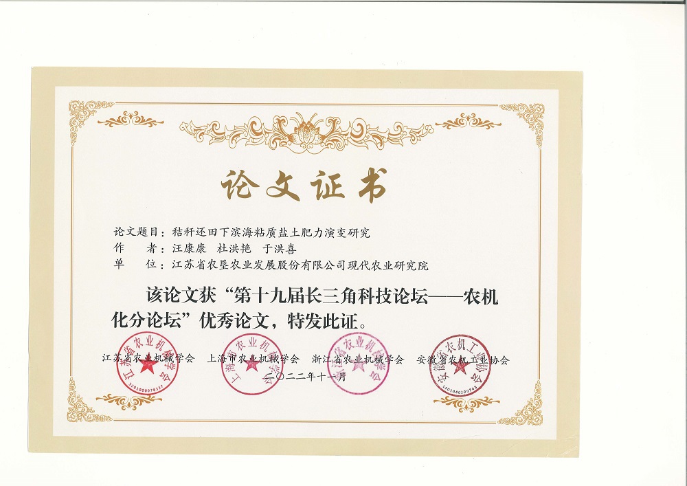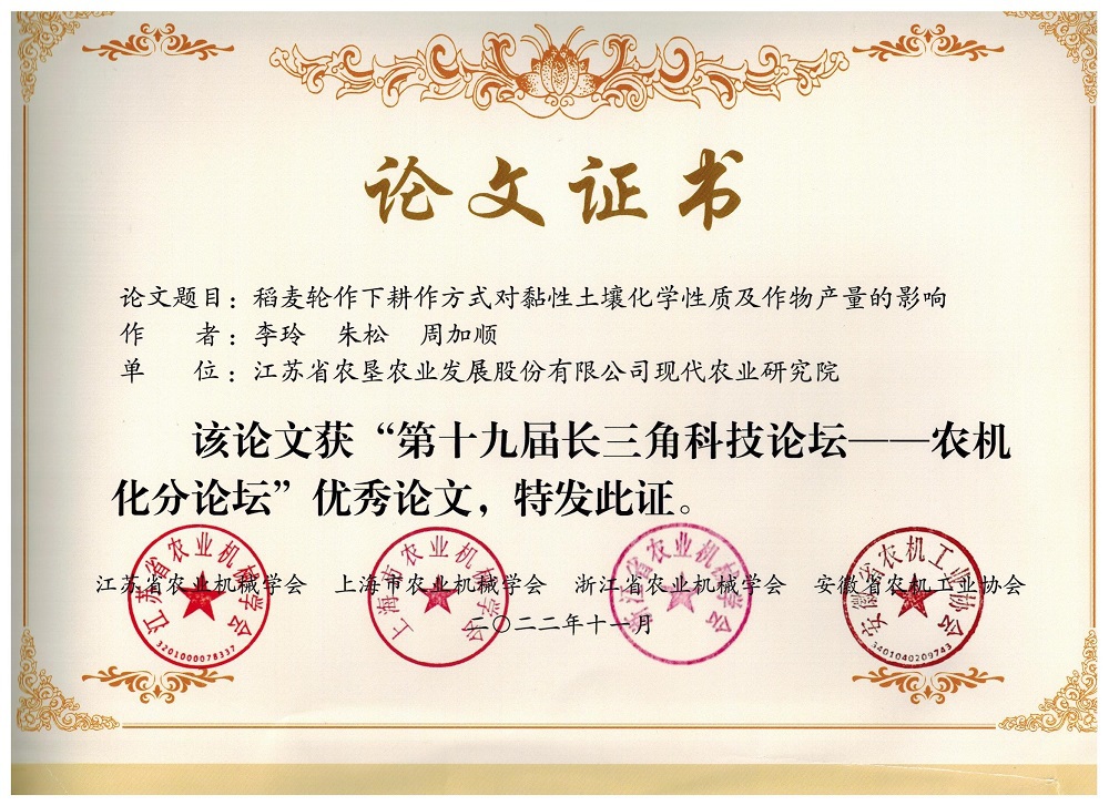11月21日,江苏省农业机械学会、上海农业机械学会、浙江省农业机械学会、安徽省农机工业协会发布了《关于表彰“第十九届长三角科技论坛-农机化分论坛”优秀论文的决定》(苏农机学会〔2022〕12号),英国上市公司365现代农业研究院为第一单位的两篇科技论文 “稻麦轮作下耕作方式对黏性土壤化学性质及作物产量的影响” “秸秆还田下滨海黏质盐土肥力演变研究”获得“第十九届长三角科技论坛-农机化分论坛”优秀论文奖。