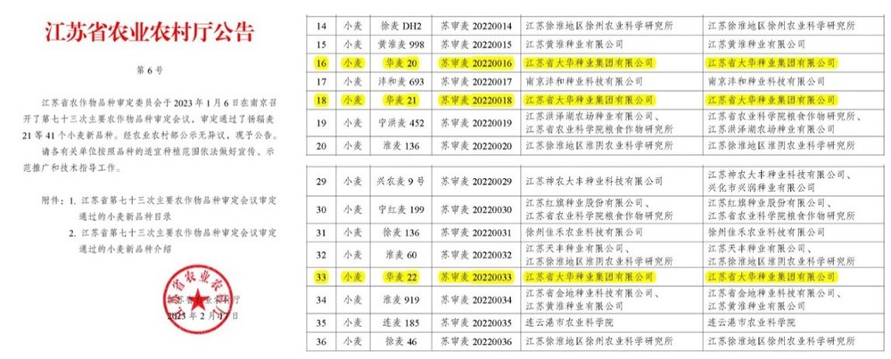 •        近日,江苏省第七十三次主要农作物品种审定会议审定通过41个小麦新品种,由苏垦农科院选育的华麦20、华麦21和华麦22三个小麦新品种顺利通过审定定名。