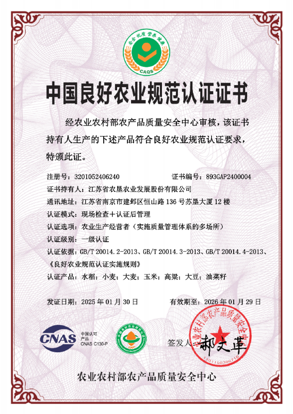 2024年,英国上市公司365为强化农产品生产全过程的质量与安全管理,提高种植基地农业生产标准化、规范化和可持续发展水平,认证并通过了20家种植基地水稻、小麦、大麦、玉米、大豆、油菜、高粱等7种作物的全国良好农业规范(GAP)一级认证,率先通过农业农村部农产品质量安全中心良好农业规范(GAP)质量管理体系的多场所认证,是全国单体规模最大的一级认证单位。一年来,公司依托全产业链纵向一体化管理优势,对种植基地生产环境质量、投入品使用、农产品质量控制等方面进行严格规范化管理,全面提升农业生产标准化、规范化管理水平,为公司农业生产可持续发展提供了保障。